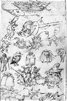 Suiveur de Bosch, Feuille d'étude avec des monstres (face), plume et encre ocre sur papier, 32,1 cm × 21,1 cm, Oxford, Ashmolean Museum.