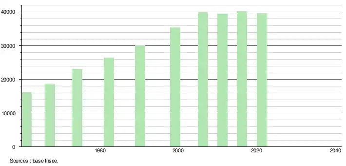 - Par convention dans Wikipédia, le principe a été retenu de n’afficher dans le tableau des recensements et le graphique, pour les populations légales postérieures à 1999, que les populations correspondant à une enquête exhaustive de recensement pour les communes de moins de 10 000 habitants, et que les populations des années 2006, 2011, 2016, etc. pour les communes de plus de 10 000 habitants, ainsi que la dernière population légale publiée par l’Insee pour l'ensemble des communes.