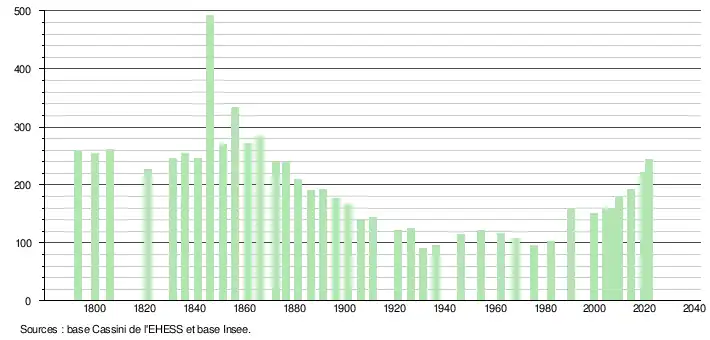 L'évolution du nombre d'habitants est connue à travers les recensements de la population effectués dans la commune depuis 1793. Pour les communes de moins de 10 000 habitants, une enquête de recensement portant sur toute la population est réalisée tous les cinq ans, les populations légales des années intermédiaires étant quant à elles estimées par interpolation ou extrapolation[21]. Pour la commune, le premier recensement exhaustif entrant dans le cadre du nouveau dispositif a été réalisé en 2004[22].