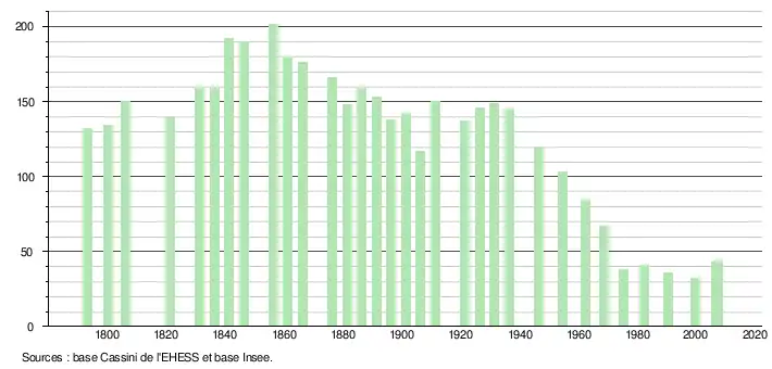 L'évolution du nombre d'habitants est connue à travers les recensements de la population effectués dans la commune depuis 1793. À partir du , les populations légales des communes sont publiées annuellement dans le cadre d'un recensement qui repose désormais sur une collecte d'information annuelle, concernant successivement tous les territoires communaux au cours d'une période de cinq ans. Pour les communes de moins de 10 000 habitants, une enquête de recensement portant sur toute la population est réalisée tous les cinq ans, les populations légales des années intermédiaires étant quant à elles estimées par interpolation ou extrapolation[2]. Pour la commune, le premier recensement exhaustif entrant dans le cadre du nouveau dispositif a été réalisé en 2006[3],[Note 1].