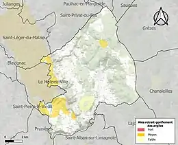 Le retrait-gonflement des sols argileux est susceptible d'engendrer des dommages importants aux bâtiments en cas d’alternance de périodes de sécheresse et de pluie. 8,1 % de la superficie communale est en aléa moyen ou fort (15,8 % au niveau départemental et 48,5 % au niveau national). Sur les 353 bâtiments dénombrés sur la commune en 2019, 93 sont en aléa moyen ou fort, soit 26 %, à comparer aux 14 % au niveau départemental et 54 % au niveau national. Une cartographie de l'exposition du territoire national au retrait gonflement des sols argileux est disponible sur le site du BRGM[27],[Carte 2].