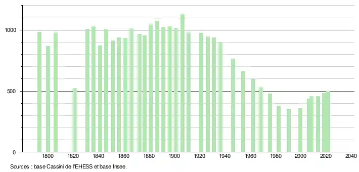 L'évolution du nombre d'habitants est connue à travers les recensements de la population effectués dans la commune depuis 1793. Pour les communes de moins de 10 000 habitants, une enquête de recensement portant sur toute la population est réalisée tous les cinq ans, les populations légales des années intermédiaires étant quant à elles estimées par interpolation ou extrapolation[31]. Pour la commune, le premier recensement exhaustif entrant dans le cadre du nouveau dispositif a été réalisé en 2008[32].