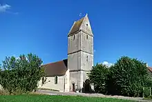 - Église paroissiale Saint-Germain (XVe siècle, clocher-porche en bâtière de 1780). Elle faisait partie du diocèse de Séez et son patronage fut donné au XIe siècle par Roger de Montgomery à l'abbaye de Troarn[28] ; vestiges opus spicatum du XIe[29]. L'édifice date du XVe siècle, les baies, la tour et le porche de 1780. Fonts baptismaux, autel, retable et tabernacle du XVIIIe.