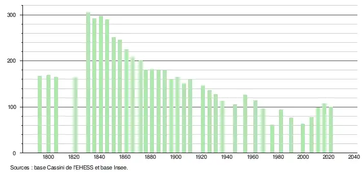 L'évolution du nombre d'habitants est connue à travers les recensements de la population effectués dans la commune depuis 1793. Pour les communes de moins de 10 000 habitants, une enquête de recensement portant sur toute la population est réalisée tous les cinq ans, les populations légales des années intermédiaires étant quant à elles estimées par interpolation ou extrapolation[25]. Pour la commune, le premier recensement exhaustif entrant dans le cadre du nouveau dispositif a été réalisé en 2006[26].