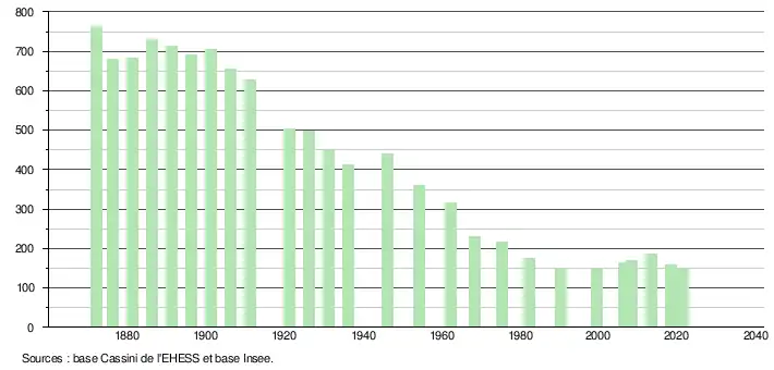 L'évolution du nombre d'habitants est connue à travers les recensements de la population effectués dans la commune depuis 1872. Pour les communes de moins de 10 000 habitants, une enquête de recensement portant sur toute la population est réalisée tous les cinq ans, les populations légales des années intermédiaires étant quant à elles estimées par interpolation ou extrapolation[18]. Pour la commune, le premier recensement exhaustif entrant dans le cadre du nouveau dispositif a été réalisé en 2008[19].