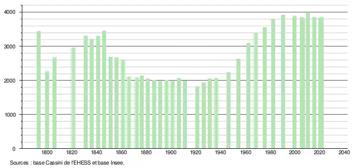 L'évolution du nombre d'habitants est connue à travers les recensements de la population effectués dans la commune depuis 1793. Pour les communes de moins de 10 000 habitants, une enquête de recensement portant sur toute la population est réalisée tous les cinq ans, les populations légales des années intermédiaires étant quant à elles estimées par interpolation ou extrapolation[22]. Pour la commune, le premier recensement exhaustif entrant dans le cadre du nouveau dispositif a été réalisé en 2005[23].