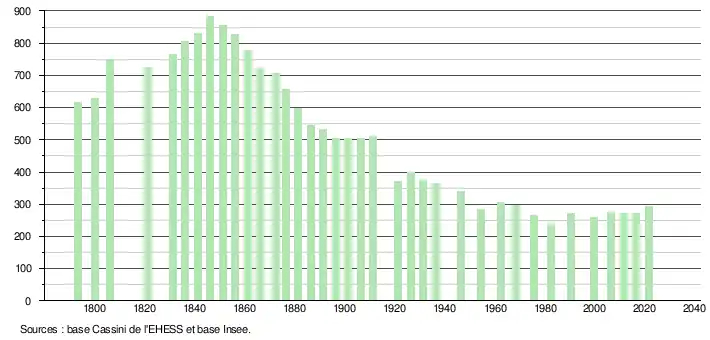L'évolution du nombre d'habitants est connue à travers les recensements de la population effectués dans la commune depuis 1793. Pour les communes de moins de 10 000 habitants, une enquête de recensement portant sur toute la population est réalisée tous les cinq ans, les populations légales des années intermédiaires étant quant à elles estimées par interpolation ou extrapolation[22]. Pour la commune, le premier recensement exhaustif entrant dans le cadre du nouveau dispositif a été réalisé en 2006[23].