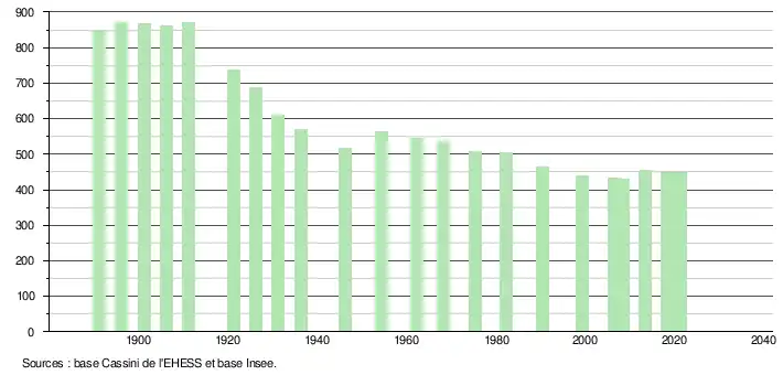 L'évolution du nombre d'habitants est connue à travers les recensements de la population effectués dans la commune depuis 1891. Pour les communes de moins de 10 000 habitants, une enquête de recensement portant sur toute la population est réalisée tous les cinq ans, les populations légales des années intermédiaires étant quant à elles estimées par interpolation ou extrapolation[16]. Pour la commune, le premier recensement exhaustif entrant dans le cadre du nouveau dispositif a été réalisé en 2008[17].