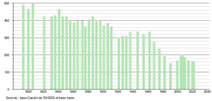 L'évolution du nombre d'habitants est connue à travers les recensements de la population effectués dans la commune depuis 1793. Pour les communes de moins de 10 000 habitants, une enquête de recensement portant sur toute la population est réalisée tous les cinq ans, les populations légales des années intermédiaires étant quant à elles estimées par interpolation ou extrapolation[22]. Pour la commune, le premier recensement exhaustif entrant dans le cadre du nouveau dispositif a été réalisé en 2004[23].