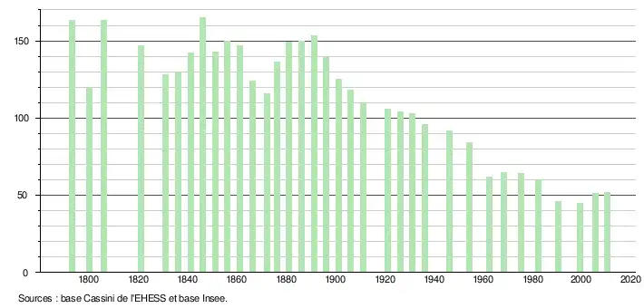 L'évolution du nombre d'habitants est connue à travers les recensements de la population effectués dans la commune depuis 1793. À partir du , les populations légales des communes sont publiées annuellement dans le cadre d'un recensement qui repose désormais sur une collecte d'information annuelle, concernant successivement tous les territoires communaux au cours d'une période de cinq ans. Pour les communes de moins de 10 000 habitants, une enquête de recensement portant sur toute la population est réalisée tous les cinq ans, les populations légales des années intermédiaires étant quant à elles estimées par interpolation ou extrapolation[15]. Pour la commune, le premier recensement exhaustif entrant dans le cadre du nouveau dispositif a été réalisé en 2005[16],[Note 2].
