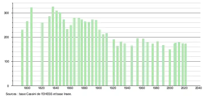 L'évolution du nombre d'habitants est connue à travers les recensements de la population effectués dans la commune depuis 1793. Pour les communes de moins de 10 000 habitants, une enquête de recensement portant sur toute la population est réalisée tous les cinq ans, les populations légales des années intermédiaires étant quant à elles estimées par interpolation ou extrapolation[23]. Pour la commune, le premier recensement exhaustif entrant dans le cadre du nouveau dispositif a été réalisé en 2007[24].