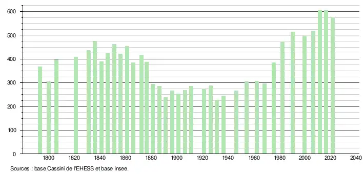 L'évolution du nombre d'habitants est connue à travers les recensements de la population effectués dans la commune depuis 1793. Pour les communes de moins de 10 000 habitants, une enquête de recensement portant sur toute la population est réalisée tous les cinq ans, les populations légales des années intermédiaires étant quant à elles estimées par interpolation ou extrapolation[26]. Pour la commune, le premier recensement exhaustif entrant dans le cadre du nouveau dispositif a été réalisé en 2006[27].