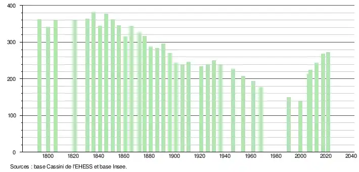 L'évolution du nombre d'habitants est connue à travers les recensements de la population effectués dans la commune depuis 1793. Pour les communes de moins de 10 000 habitants, une enquête de recensement portant sur toute la population est réalisée tous les cinq ans, les populations légales des années intermédiaires étant quant à elles estimées par interpolation ou extrapolation[27]. Pour la commune, le premier recensement exhaustif entrant dans le cadre du nouveau dispositif a été réalisé en 2007[28].