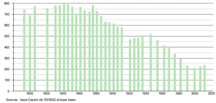 L'évolution du nombre d'habitants est connue à travers les recensements de la population effectués dans la commune depuis 1793. À partir du , les populations légales des communes sont publiées annuellement dans le cadre d'un recensement qui repose désormais sur une collecte d'information annuelle, concernant successivement tous les territoires communaux au cours d'une période de cinq ans. Pour les communes de moins de 10 000 habitants, une enquête de recensement portant sur toute la population est réalisée tous les cinq ans, les populations légales des années intermédiaires étant quant à elles estimées par interpolation ou extrapolation[7]. Pour la commune, le premier recensement exhaustif entrant dans le cadre du nouveau dispositif a été réalisé en 2006[8],[Note 2].