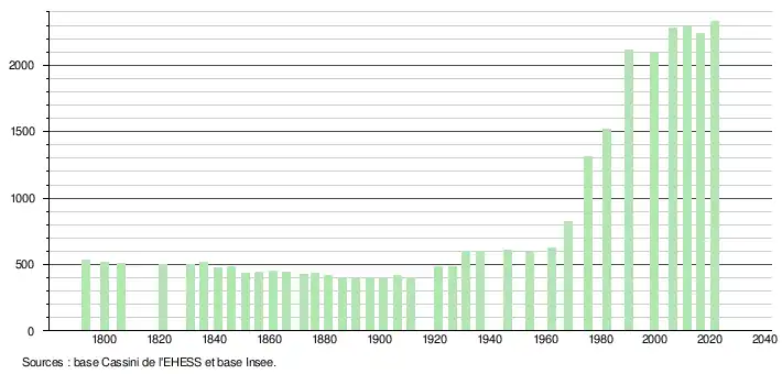 L'évolution du nombre d'habitants est connue à travers les recensements de la population effectués dans la commune depuis 1793. Pour les communes de moins de 10 000 habitants, une enquête de recensement portant sur toute la population est réalisée tous les cinq ans, les populations légales des années intermédiaires étant quant à elles estimées par interpolation ou extrapolation[29]. Pour la commune, le premier recensement exhaustif entrant dans le cadre du nouveau dispositif a été réalisé en 2006[30].