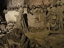 Ce monument s'est détérioré avec le temps. Le fond, sur le mur, a subi au moins trois modifications, discernables aux couleurs différentes du matériau. Le calice tenu par l’ange a perdu sa partie supérieure et la traverse de la croix a disparu ; l’un des apôtres voit sa main droite amputée de ses phalangettes. Le socle qui représente le sol est fissuré, des graffitis déparent le bloc sur lequel se tient l’ange et des plaques noires mangent la pierre sur certaines statues.