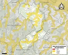 Le retrait-gonflement des sols argileux est susceptible d'engendrer des dommages importants aux bâtiments en cas d’alternance de périodes de sécheresse et de pluie. 30,8 % de la superficie communale est en aléa moyen ou fort (33,6 % au niveau départemental et 48,5 % au niveau national). Sur les 169 bâtiments dénombrés sur la commune en 2019, 52 sont en aléa moyen ou fort, soit 31 %, à comparer aux 25 % au niveau départemental et 54 % au niveau national. Une cartographie de l'exposition du territoire national au retrait gonflement des sols argileux est disponible sur le site du BRGM[18],[Carte 2].