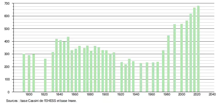 L'évolution du nombre d'habitants est connue à travers les recensements de la population effectués dans la commune depuis 1793. Pour les communes de moins de 10 000 habitants, une enquête de recensement portant sur toute la population est réalisée tous les cinq ans, les populations légales des années intermédiaires étant quant à elles estimées par interpolation ou extrapolation[19]. Pour la commune, le premier recensement exhaustif entrant dans le cadre du nouveau dispositif a été réalisé en 2006[20].