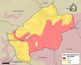 Le retrait-gonflement des sols argileux est susceptible d'engendrer des dommages importants aux bâtiments en cas d’alternance de périodes de sécheresse et de pluie. 99,5 % de la superficie communale est en aléa moyen ou fort (84,7 % au niveau départemental et 48,5 % au niveau national). Sur les 1 022 bâtiments dénombrés sur la commune en 2019, 1003 sont en aléa moyen ou fort, soit 98 %, à comparer aux 86 % au niveau départemental et 54 % au niveau national. Une cartographie de l'exposition du territoire national au retrait gonflement des sols argileux est disponible sur le site du BRGM[26],[27].