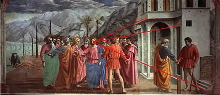 La compréhension de l'œuvre est facilitée par la perspective et l'observation naturaliste, qui créent un paysage vivant et réaliste comme encore jamais vu dans la peinture[11]. Toutes les lignes de fuite convergent vers le visage[12] du Christ, qui se détache du groupe d'apôtres et qui devient ainsi le pivot de toute la représentation. Le même schéma de perspective se trouve également sur le mur opposé, où Masolino a peint la Guérison de l'infirme et la résurrection de Tabita, mais dans ce cas, il n'y a pas d'élément significatif du point de fuite : les différentes scènes semblent dispersées, avec de faibles connexions.