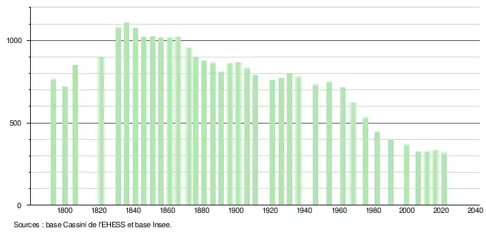 L'évolution du nombre d'habitants est connue à travers les recensements de la population effectués dans la commune depuis 1793. Pour les communes de moins de 10 000 habitants, une enquête de recensement portant sur toute la population est réalisée tous les cinq ans, les populations légales des années intermédiaires étant quant à elles estimées par interpolation ou extrapolation[26]. Pour la commune, le premier recensement exhaustif entrant dans le cadre du nouveau dispositif a été réalisé en 2006[27].