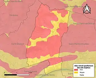 Le retrait-gonflement des sols argileux est susceptible d'engendrer des dommages importants aux bâtiments en cas d’alternance de périodes de sécheresse et de pluie. La totalité de la commune est en aléa moyen ou fort (67,4 % au niveau départemental et 48,5 % au niveau national). Sur les 374 bâtiments dénombrés sur la commune en 2019, 374 sont en aléa moyen ou fort, soit 100 %, à comparer aux 84 % au niveau départemental et 54 % au niveau national. Une cartographie de l'exposition du territoire national au retrait gonflement des sols argileux est disponible sur le site du BRGM[22],[Carte 2].