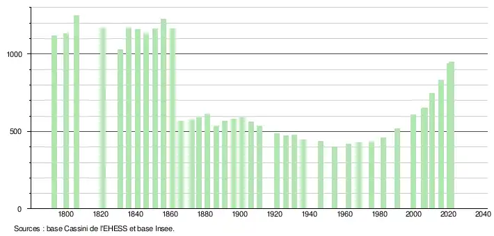 L'évolution du nombre d'habitants est connue à travers les recensements de la population effectués dans la commune depuis 1793. Pour les communes de moins de 10 000 habitants, une enquête de recensement portant sur toute la population est réalisée tous les cinq ans, les populations légales des années intermédiaires étant quant à elles estimées par interpolation ou extrapolation[28]. Pour la commune, le premier recensement exhaustif entrant dans le cadre du nouveau dispositif a été réalisé en 2005[29].