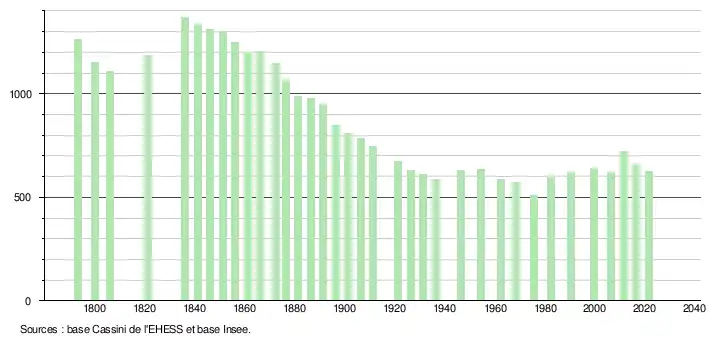 L'évolution du nombre d'habitants est connue à travers les recensements de la population effectués dans la commune depuis 1793. Pour les communes de moins de 10 000 habitants, une enquête de recensement portant sur toute la population est réalisée tous les cinq ans, les populations légales des années intermédiaires étant quant à elles estimées par interpolation ou extrapolation[24]. Pour la commune, le premier recensement exhaustif entrant dans le cadre du nouveau dispositif a été réalisé en 2006[25].