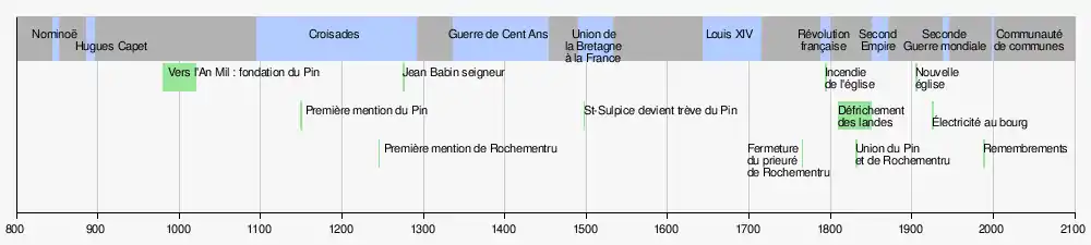 La commune a reçu sa forme actuelle en 1831, lorsqu'elle a annexé la petite commune voisine de Rochementru. Les deux paroisses du Pin et de Rochementru ont connu une histoire similaire, puisqu'elles furent toutes les deux établies par des religieux au XIe siècle. Le Pin a été fondé par des moines défricheurs de l'abbaye Saint-Nicolas d'Angers, tandis que Rochementru est née autour d'une maladrerie desservie par l'abbaye Toussaint d'Angers. Les curés des deux paroisses avaient le titre de prieur, et celui de Rochementru était également baron. Sous l'Ancien régime, Le Pin comprenait la seigneurie de la Babinais, avant qu'elle disparaisse au XVIIe siècle. L'époque contemporaine a été marquée par la modernisation agraire et par l'exode rural. Le début du XXIe siècle connaît cependant une augmentation de population liée à la périurbanisation de la Loire-Atlantique.