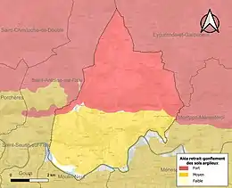 Les mouvements de terrains susceptibles de se produire sur la commune sont des tassements différentiels[46]. Le retrait-gonflement des sols argileux est susceptible d'engendrer des dommages importants aux bâtiments en cas d’alternance de périodes de sécheresse et de pluie[47]. 97,2 % de la superficie communale est en aléa moyen ou fort (58,6 % au niveau départemental et 48,5 % au niveau national métropolitain)[Carte 4]. Depuis le , en application de la loi ÉLAN, différentes contraintes s'imposent aux vendeurs, maîtres d'ouvrages ou constructeurs de biens situés dans une zone classée en aléa moyen ou fort[Note 6],[48].