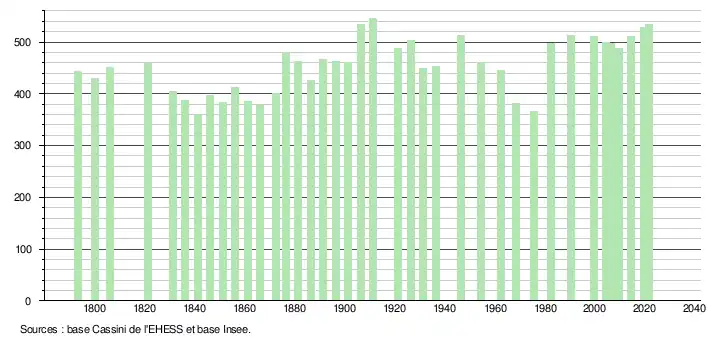 L'évolution du nombre d'habitants est connue à travers les recensements de la population effectués dans la commune depuis 1793. Pour les communes de moins de 10 000 habitants, une enquête de recensement portant sur toute la population est réalisée tous les cinq ans, les populations légales des années intermédiaires étant quant à elles estimées par interpolation ou extrapolation[24]. Pour la commune, le premier recensement exhaustif entrant dans le cadre du nouveau dispositif a été réalisé en 2004[25].