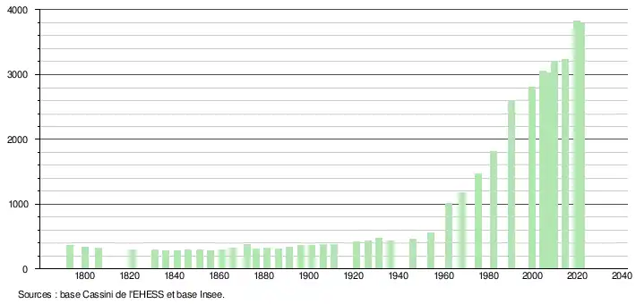 L'évolution du nombre d'habitants est connue à travers les recensements de la population effectués dans la commune depuis 1793. Pour les communes de moins de 10 000 habitants, une enquête de recensement portant sur toute la population est réalisée tous les cinq ans, les populations légales des années intermédiaires étant quant à elles estimées par interpolation ou extrapolation[25]. Pour la commune, le premier recensement exhaustif entrant dans le cadre du nouveau dispositif a été réalisé en 2004[26].
