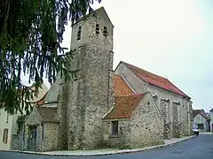 Le clocher au toit en bâtière est garni de deux contreforts par côté, qui lui confèrent un aspect défensif. La nef se compose de trois travées et se termine par un chœur à pans coupés. Il est voûté à l'intérieur[32]. Entre le clocher et la nef, s'entrepose un narthex, et la sacristie y est accolée au sud.