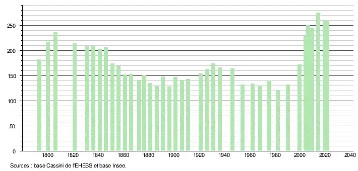 L'évolution du nombre d'habitants est connue à travers les recensements de la population effectués dans la commune depuis 1793. Pour les communes de moins de 10 000 habitants, une enquête de recensement portant sur toute la population est réalisée tous les cinq ans, les populations légales des années intermédiaires étant quant à elles estimées par interpolation ou extrapolation[41]. Pour la commune, le premier recensement exhaustif entrant dans le cadre du nouveau dispositif a été réalisé en 2004[42].