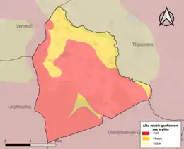 La commune est vulnérable au risque de mouvements de terrains constitué principalement du retrait-gonflement des sols argileux[15]. Cet aléa est susceptible d'engendrer des dommages importants aux bâtiments en cas d’alternance de périodes de sécheresse et de pluie. La totalité de la commune est en aléa moyen ou fort (90 % au niveau départemental et 48,5 % au niveau national). Sur les 119 bâtiments dénombrés sur la commune en 2019, 119 sont en aléa moyen ou fort, soit 100 %, à comparer aux 83 % au niveau départemental et 54 % au niveau national. Une cartographie de l'exposition du territoire national au retrait gonflement des sols argileux est disponible sur le site du BRGM[16],[Carte 2].