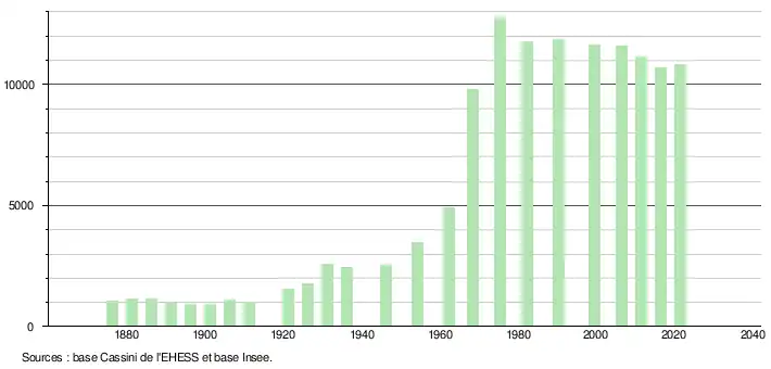 L'évolution du nombre d'habitants est connue à travers les recensements de la population effectués dans la commune depuis 1876. Pour les communes de plus de 10 000 habitants les recensements ont lieu chaque année à la suite d'une enquête par sondage auprès d'un échantillon d'adresses représentant 8 % de leurs logements, contrairement aux autres communes qui ont un recensement réel tous les cinq ans[26],[Note 4].