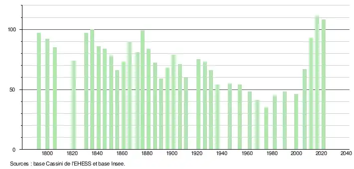 L'évolution du nombre d'habitants est connue à travers les recensements de la population effectués dans la commune depuis 1793. Pour les communes de moins de 10 000 habitants, une enquête de recensement portant sur toute la population est réalisée tous les cinq ans, les populations légales des années intermédiaires étant quant à elles estimées par interpolation ou extrapolation[18]. Pour la commune, le premier recensement exhaustif entrant dans le cadre du nouveau dispositif a été réalisé en 2006[19].