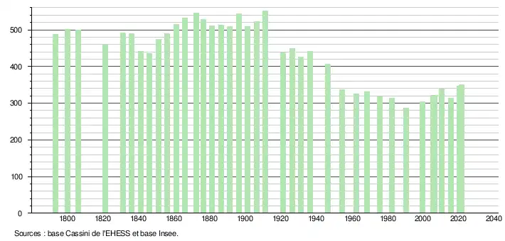 L'évolution du nombre d'habitants est connue à travers les recensements de la population effectués dans la commune depuis 1793. Pour les communes de moins de 10 000 habitants, une enquête de recensement portant sur toute la population est réalisée tous les cinq ans, les populations légales des années intermédiaires étant quant à elles estimées par interpolation ou extrapolation[21]. Pour la commune, le premier recensement exhaustif entrant dans le cadre du nouveau dispositif a été réalisé en 2005[22].