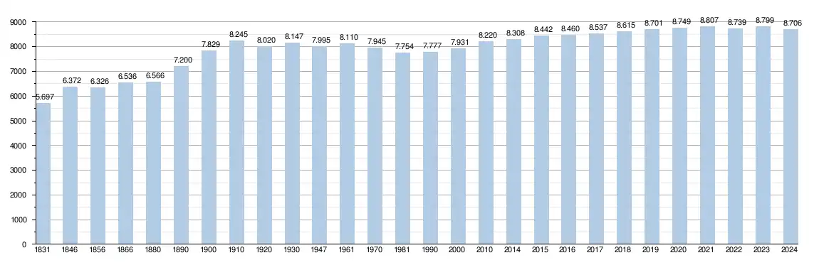 Elle comptait, au , 8 709 habitants (4 289 hommes et 4 420 femmes) [3], soit une densité de 200,62 habitants/km² pour une superficie de 43,41 km²[4].