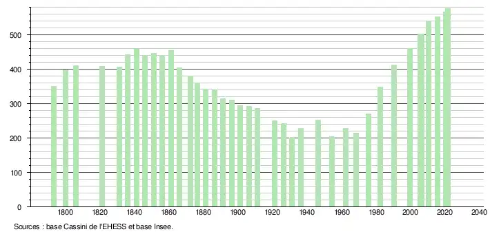 L'évolution du nombre d'habitants est connue à travers les recensements de la population effectués dans la commune depuis 1793. Pour les communes de moins de 10 000 habitants, une enquête de recensement portant sur toute la population est réalisée tous les cinq ans, les populations légales des années intermédiaires étant quant à elles estimées par interpolation ou extrapolation[24]. Pour la commune, le premier recensement exhaustif entrant dans le cadre du nouveau dispositif a été réalisé en 2005[25].