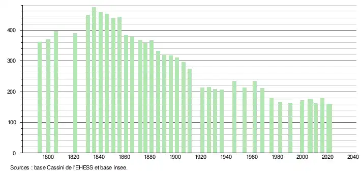 L'évolution du nombre d'habitants est connue à travers les recensements de la population effectués dans la commune depuis 1793. Pour les communes de moins de 10 000 habitants, une enquête de recensement portant sur toute la population est réalisée tous les cinq ans, les populations légales des années intermédiaires étant quant à elles estimées par interpolation ou extrapolation[26]. Pour la commune, le premier recensement exhaustif entrant dans le cadre du nouveau dispositif a été réalisé en 2005[27].