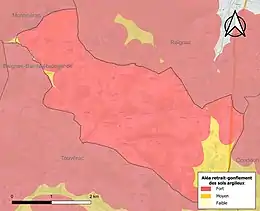Le retrait-gonflement des sols argileux est susceptible d'engendrer des dommages importants aux bâtiments en cas d’alternance de périodes de sécheresse et de pluie. La totalité de la commune est en aléa moyen ou fort (67,4 % au niveau départemental et 48,5 % au niveau national). Sur les 200 bâtiments dénombrés sur la commune en 2019, 200 sont en aléa moyen ou fort, soit 100 %, à comparer aux 81 % au niveau départemental et 54 % au niveau national. Une cartographie de l'exposition du territoire national au retrait gonflement des sols argileux est disponible sur le site du BRGM[22],[Carte 3].