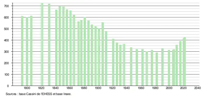L'évolution du nombre d'habitants est connue à travers les recensements de la population effectués dans la commune depuis 1793. Pour les communes de moins de 10 000 habitants, une enquête de recensement portant sur toute la population est réalisée tous les cinq ans, les populations légales des années intermédiaires étant quant à elles estimées par interpolation ou extrapolation[36]. Pour la commune, le premier recensement exhaustif entrant dans le cadre du nouveau dispositif a été réalisé en 2005[37].