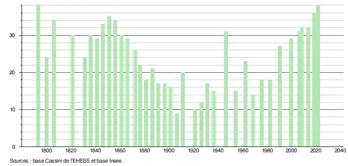 L'évolution du nombre d'habitants est connue à travers les recensements de la population effectués dans la commune depuis 1793. Pour les communes de moins de 10 000 habitants, une enquête de recensement portant sur toute la population est réalisée tous les cinq ans, les populations légales des années intermédiaires étant quant à elles estimées par interpolation ou extrapolation[27]. Pour la commune, le premier recensement exhaustif entrant dans le cadre du nouveau dispositif a été réalisé en 2008[28].