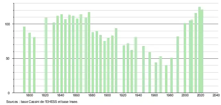 L'évolution du nombre d'habitants est connue à travers les recensements de la population effectués dans la commune depuis 1793. Pour les communes de moins de 10 000 habitants, une enquête de recensement portant sur toute la population est réalisée tous les cinq ans, les populations légales des années intermédiaires étant quant à elles estimées par interpolation ou extrapolation[25]. Pour la commune, le premier recensement exhaustif entrant dans le cadre du nouveau dispositif a été réalisé en 2008[26].