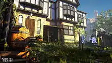 Évolution entre les esquisses des lieux en 2D et leur réalisation en 3D (textures non appliquées). À droite : un dessin technique d'un lieu du jeu, de ses animations et de ses endroits interactifs. | ||||