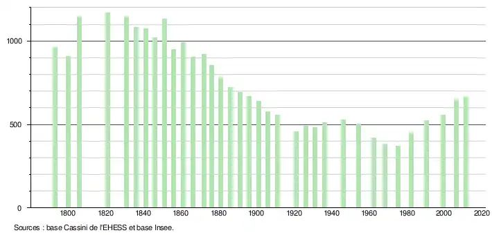 - Dans le tableau des recensements et le graphique, par convention dans Wikipédia, le principe a été retenu, pour les populations légales postérieures à 1999 de n’afficher dans le tableau des recensements et le graphique que les populations correspondant à l'année 2006, première population légale publiée calculée conformément aux concepts définis dans le décret no 2003-485 du 5 juin 2003, et les années correspondant à une enquête exhaustive de recensement pour les communes de moins de 10 000 habitants, ainsi que la dernière population légale publiée par l’Insee.
