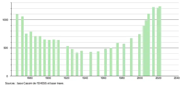 L'évolution du nombre d'habitants est connue à travers les recensements de la population effectués dans la commune depuis 1866. Pour les communes de moins de 10 000 habitants, une enquête de recensement portant sur toute la population est réalisée tous les cinq ans, les populations légales des années intermédiaires étant quant à elles estimées par interpolation ou extrapolation[26]. Pour la commune, le premier recensement exhaustif entrant dans le cadre du nouveau dispositif a été réalisé en 2004[27].