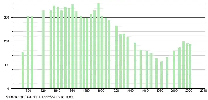 L'évolution du nombre d'habitants est connue à travers les recensements de la population effectués dans la commune depuis 1793. Pour les communes de moins de 10 000 habitants, une enquête de recensement portant sur toute la population est réalisée tous les cinq ans, les populations légales des années intermédiaires étant quant à elles estimées par interpolation ou extrapolation[14]. Pour la commune, le premier recensement exhaustif entrant dans le cadre du nouveau dispositif a été réalisé en 2007[15].