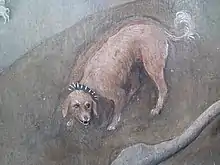 Une alêne est fixée à ce dernier, ce qui a fait dire qu'il s'agissait d'un mercier ambulant exerçant son métier de porte à porte. L'homme transporte sur le dos un panier tel qu'en portaient effectivement les colporteurs comme on en voit chez Pieter Brueghel l'Ancien. Mercier ou non, il s'agit d'un personnage sans point d'attaches — colporteur, pèlerin, vagabond — qui quitte un lieu de péché. L'auberge et le cygne de son enseigne, la cruche vide enfilée sur un bâton signalent un lieu mal famé, un bordel. D'autres éléments peuvent aussi avoir une connotation particulière, soit néfaste, soit érotique, ou au contraire bénéfique : les cruches, le tonneau, les pies, la mésange, le chien, la patte de cochon (celle-ci signale aussi la tente de l’Allégorie des plaisirs), la chouette… L'homme s'éloigne comme un fugitif mais, résolument, il tourne une dernière fois la tête et se défend du chien qui n'a pas l'air menaçant ici (mais le dessin sous-jacent qui transparaît sous la fine couche de couleur prévoyait un animal plus costaud). Ce chien porte au cou un collier hérissé de pointes comme en portaient les chiens de chasse. Ce collier les protégeait des morsures que pouvaient leur infliger les animaux pourchassés. L'un des bourreaux du Couronnement d'épines (Londres) porte un collier semblable.